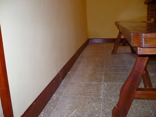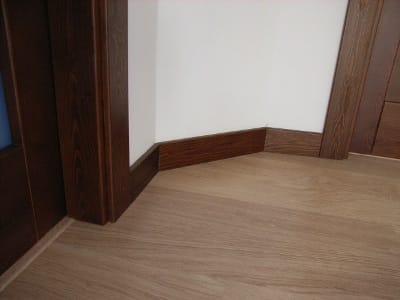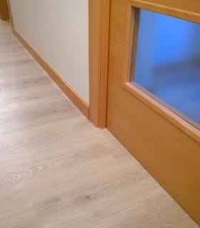 Puertas oscuras caoba. Laminado roble claro y rodapié blanco