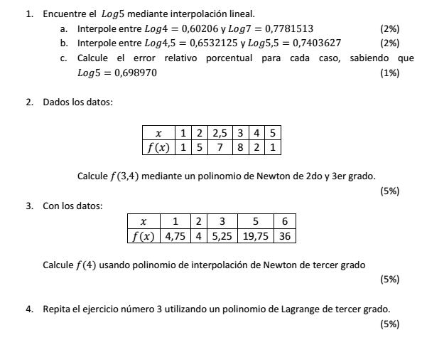 $$\begin{align}&y=y_1+m(x-x_1)\\&\\&m= \frac{\Delta y}{ \Delta x}= \frac{y_2-y_1}{x_2-x_1}=\frac{log7-log4}{7-4}= \frac{0.7781513-0.60206}{3}=0.0586971\\&\\&f(x)=0.6026+0.0586971(x-4)\\&\\&f(5)=0.6607571\\&\\&b)\\&y=y_1+m(x-x_1)\\&\\&m= \frac{\Delta y}{ \Delta x}= \frac{y_2-y_1}{x_2-x_1}=\frac{log5.5-log4.5}{5.5-4.5}= \frac{0.7403627-0.6532125}{1}=0.0871502\\&\\&f(x)=0.6532125+0.0871502(x-4.5)\\&\\&f(5)=0.6967876\\&\\&c)\\&\%Er=\frac{|log5-f(5)|}{log5}\times100 =\frac{|0.698970-0.6607577|}{0.698970}\times 100=5.467\%\\&\\&\%Er=\frac{|log5-f(5)|}{log5}\times100 =\frac{|0.698970-0.6967876|}{0.698970}\times 100=0.3 \%\\&\\&\\&\end{align}$$