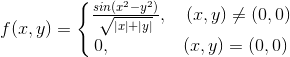 $$\begin{align}&\lim_{(x,y) \to (0,0)}\sin(x^2-y^2)= \lim_{(x,y) \to (0,0)}(x^2-y^2)\\&\\&límites \ reiterados:\\&\lim_{(x,y) \to (0,0)}\frac{\sin(x^2-y^2)}{ \sqrt {|x|+|y|}}= \lim_{(x,y) \to (0,0)}\frac{(x^2-y^2)}{ \sqrt {|x|+|y|}}=\\&\\&\lim_{x \to 0}\Bigg(\lim_{y\to 0} \frac{(x^2-y^2)}{ \sqrt {|x|+|y|}}\Bigg)=\lim_{x \to 0} \frac{x^2}{ \sqrt {|x|}}=\lim_{x \to 0} |x|^\frac 3 2=0\\&\\&\\&\lim_{y \to 0}\Bigg(\lim_{x\to 0} \frac{(x^2-y^2)}{ \sqrt {|x|+|y|}}\Bigg)=\lim_{y \to 0} \frac{-y^2}{ \sqrt {|y|}}=-\lim_{y \to 0} |y|^\frac 3 2=0\\&\\&Límites \ Radiales\\&y=mx\\&\lim_{(x,y) \to (0,0)}\frac{(x^2-y^2)}{ \sqrt {|x|+|y|}}=\lim_{x \to 0}\frac{(x^2-m^2x^2)}{ \sqrt {|x|+|mx|}}=\\&\\&\lim_{x \to 0}\frac{|x|^\frac 3 2(1-m^2)}{ \sqrt {1+|m|}}=0\\&\\&No \ dependen \ de \ m\\&\\&En \ polares:\lim_{(x,y) \to (0,0)}\frac{(x^2-y^2)}{ \sqrt {|x|+|y|}}\\&\\&\lim_{ r \to 0}\frac{r^2cos^2 \theta-r^2sen^2 \theta}{\sqrt{|r \cos \theta|+| r sen \theta|}}=\lim_{ r \to 0}\frac{r^2(\cos^2 \theta-sen^2 \theta)}{\sqrt{|r \cos \theta|+| r sen \theta|}}=\\&\\&\lim_{ r \to 0}\frac{r^2cos(2 \theta)}{\sqrt{|r \cos \theta|+| r sen \theta|}}=\\&\\&\lim_{ r \to 0}\frac{|r|^\frac 32cos(2 \theta)}{\sqrt{| \cos \theta|+| sen \theta|}}=0\\&\\&No \ depende\ de \ \theta\\&\end{align}$$