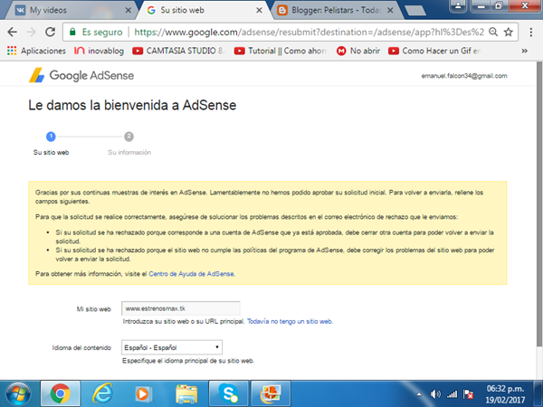 Tengo un problema al intentar validar una solicitud en adsense