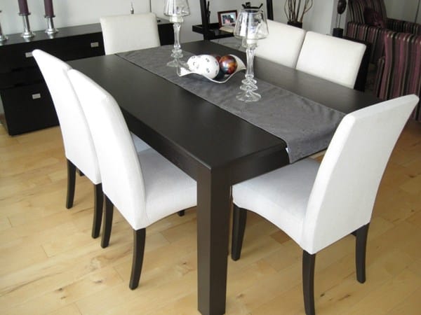 1- Pinta la mesa del mismo color que el mueble del salón (marrón oscuro). ¿Qué ganarás? Hacerla destacar entre las sillas y combinarlo con el mobiliario existente sin salirte del estilo y tonalidades de tu salón.