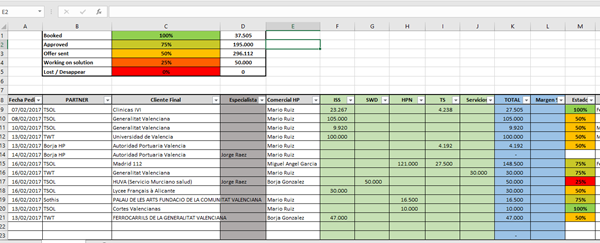 Uso una hoja de calculo en el que tengo plasmados todos mis proyectos. En una columna (M), tengo formato condicional de forma a que de una vistazo rápido, por colores, pueda ver el estado general de los proyectos (del 0% al 100% dividido en 4 tramos).