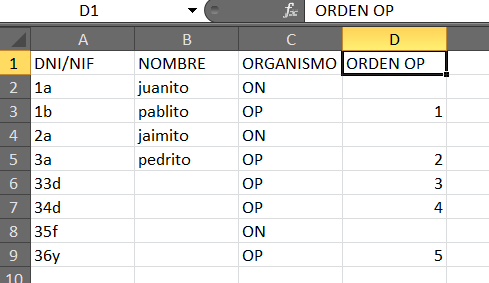 Quiero saber como hacer de una lista de 210 empleados hacer un numero de orden. O sea de esta manera, si de los 210 empleados, 150 aportan a un Organismo nacional = (ON) y 60 lo hacen a un Organismo Provincial =(OP), quiero saber que formula utilizar para poder enumerar esos 60 empleados.