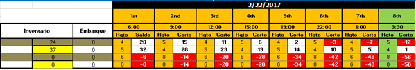 Manejo un pequeño almacen donde despacho cada 3 horas materiales, y cada fin de turno genero un inventario físico en una hoja excel y calculo en base a inventario hasta cuando tengo cobertura de material, en base a la hora y el día, es decir si tengo 400 pz cubro embarque 1(06:00 horas ) embarque 2 (09:00 horas) del día 21 de febrero,