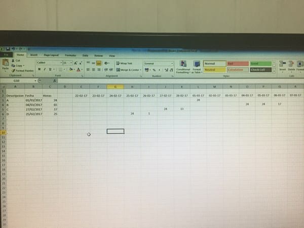 Tengo una fecha y un valor de Hrs, estos datos yo los ingreso, primero con la fecha me ubica en una fila y a partir de ahi me ingresa las horas dias por dia (24 hrs/dia) ejem 1: si tengo 50 hrs el 1 enero, esto se distribuira de la siguiente manera: 1 enero = 24 hrs, 2 enero = 24 hrs y 3 enero 2 hrs. Ejem 2: si tengo 112 hrs el 1 febrero, esto será asi: 1 feb = 24 hrs, 2 feb = 24 hrs, 3 feb = 24 hrs, 4 feb = 24 hrs y 5 feb = 4 hrs. Esto se tiene que dar en un rango de 1 a 600.