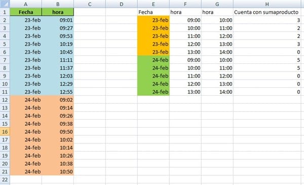 =SUMAPRODUCTO(($A$2:$A$21=E2)*($B$2:$B$21>=F2)*($B$2:$B$21<G2))