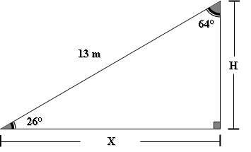 Se coloca una escalera de 13m de longitud apoyada en un muro, la cual forma un ángulo de 64° entre ellos. Determina la altura del muro para formar este ángulo con la escalera y la distancia entre el pie de la escalera y el muro.