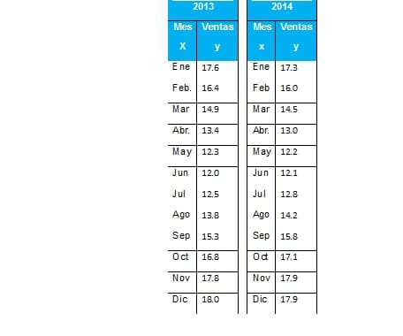 - La siguiente tabla muestra el promedio de las ventas mensuales (en miles de pesos) de la Fábrica “El patito” durante dos años consecutivos (2009-2010). Este conocimiento permite a los encargados de producción estimar la materia prima necesaria para solicitarla al departamento de compras cada mes durante el 2015 para asegurar la fabricación de su producto.