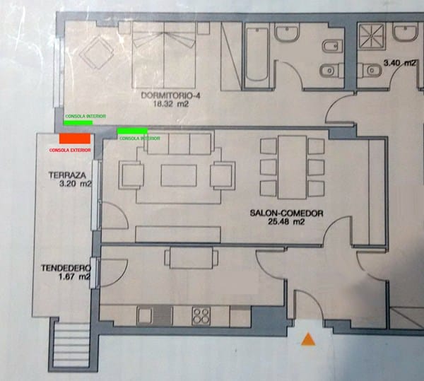 En el interior tengo dos opciones, o poner sólo aire acondicionado en el salón (25 metros cuadrados), o poner aire en el salón y en el dormitorio de 18 metros cuadrados (poniendo dos consolas en el interior, una en el salón y otra en el dormitorio).
