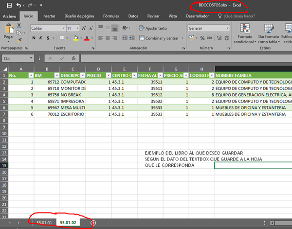 Resulta que tengo un userform el cual necesito capturo algunos datos estos actualmente se guardan en una hoja de este mismo libro. Ahora bien necesito que se que se guarden de igual manera en un libro diferente el cual se llama "BDCCOSTOS" adentro de este libro tiene varias hojas cuyos nombres están constituidos de la siguiente manera "55.01.01" "55.01.02" "55.02.01" etc.