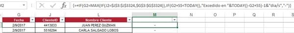=SI(G9=MAX(SI(J9=$J$12:$J$60000;$G$12:$G$60000));SI(G9+55<HOY();"Excedido en "&HOY()-(G9+55)-1&" dia/s";"-"))