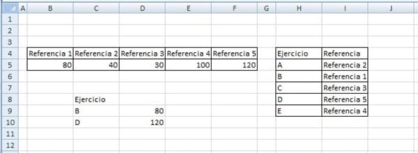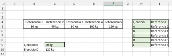 Necesito sacar el valor de la celda C9 mediante una búsqueda que por un lado tiene que identificar en una base de datos (H4:I9) que tipo de referencia tiene el ejercicio seleccionado (B, celda B9) y a partir de ahi identificar el valor referencia en una segunda tabla (B4:F5) cuyo valor obligatoriamente se encuentra debajo (en el ejemplo B5).