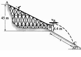 Una esquiadora de 62 kg parte del reposo en la cima de una rampa de esquiar, punto A (ver figura) y viaja hacia abajo por la rampa. Si se ignoran la fricción y la resistencia del aire: a) determine su rapidez VB cuando ella alcan