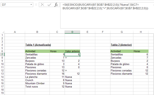 Resulta que tengo 2 tablas cada una con 2 columnas, que describen una actividad y el número de horas asociadas para realizarla. La tabla 1 la he denominado "Actualizada" porque tiene más filas que la Tabla2 y posee un mayor número de horas en algunas actividades. Lo que requiero es encontrar aquellas actividades que han sido agregadas nuevas Y LO MÁS IMPORTANTE conocer las actividades viejas que cambiaron su número de horas asociadas.