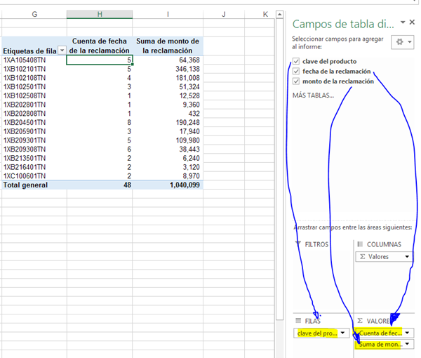 - Arrastra la etiqueta "Clave de Producto" al área de FILAS.