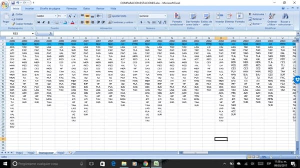 De la serie de datos que muestro a continuación, quisiera saber cuales de las estaciones que aparecen (con nombre abreviado) se repiten por cada tipo de contaminante (color azul), esto para poder elegir que estaciones tomare en cuenta para una investigación, y sera la que este más constante del año 2000 al 2015.