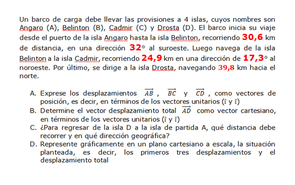 Un barco de carga debe llevar las provisiones a 4 islas, cuyos nombres son Angaro (A), Belinton (B), Cadmir (C) y Drosta (D). El barco inicia su viaje desde el puerto de la isla Angaro hasta la isla Belinton, recorriendo 30,6 km de distancia, en una dirección 32° al suroeste. Luego navega de la isla Belinton a la isla Cadmir, recorriendo 24,9 km en una dirección de 17,3° al noroeste. Por último, se dirige a la isla Drosta, navegando 39,8 km hacia el norte.