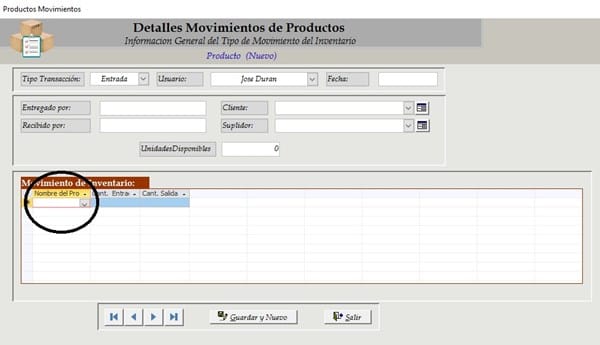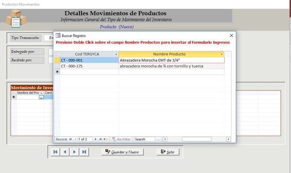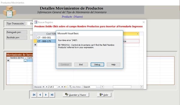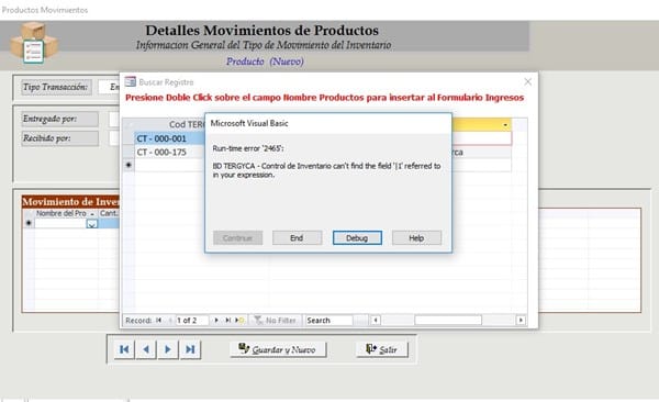 En este punto cuando le doy doble click para seleccionar el nombre del producto para que lo seleccione y lo coleque en el subformulario, allí se queda y me da el siguiente error.