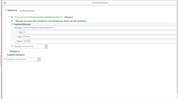 La cuestión es la siguiente, he intentado crear un mensaje cuando ‘UnidadesDisponibles’ sea igual o menor que ‘NivelNuevoPedido’. En la submacro he puesto [Formularios]![frmPedidos]![UnidadesDisponibles]=<[UnidadesDisponibles] (los dos campos se nombran igual) y a continuación me lanza el mensaje para hacer un nuevo pedido del producto. El problema es que me lanza el mensaje siempre, tenga las unidades disponibles que tenga. Es obvio que algo hago mal...