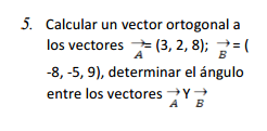 Calcular un vector ortogonal a los vectores = (3, 2, 8); = ( -8, -5, 9), determinar el ángulo entre los vectores Y