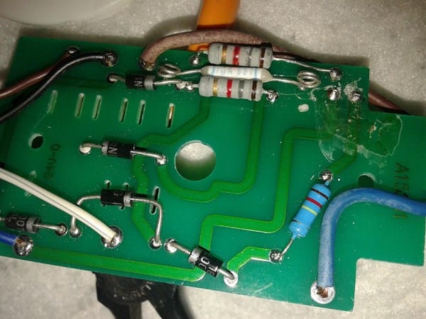 Tras comprobar que los diodos y resistencias parecían estar bien llegué a la conclusión de que el elemento que aparece en la primera imagen entre las dos resistencias era un fusible térmico. Estaba abierto y decidí sustituirlo, a modo de prueba, por un hilo conductor aislado. Con eso la manta parecía funcionar (el led ya se encendía) pero antes de calentarse apreciablemente comprobé que el mando de control estaba muy caliente, tanto que el plástico situado sobre las dos resistencias empezaba a ablandarse. Concluí que debía haber otra avería que fue la que provocó que el fusible térmico se abriera. Pero no tengo muy claro cuál puede ser esa avería. Al mando de control entran los dos hilos de alterna (azul y marrón desde la parte derecha de la primera imagen) y salen cuatro hilos (blanco, azul, marrón y negro) hacia la manta. He soltado los hilos que van a la manta y he medido las resistencias entre cada par de hilos y me da lo siguiente: