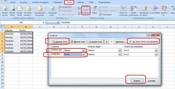 Es decir: necesito ordenar la primer columna y luego que las fechas queden ordenadas por cada grupo de objetos.