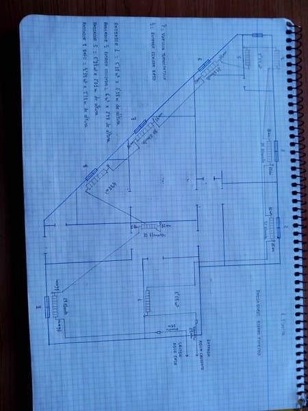 La entrada principal del agua caliente tiene un diámetro de tubería cobre de 19mm, el radiador 2 y 3 la entrada y salida de la tubería de cobre es de 16mm, el radiador 6 la entrada y salida de la tubería de cobre es de 14mm, el radiador 7 la entrada y salida de la tubería de cobre es de 16mm, el radiador 9 la entrada y salida de la tubería de cobre es de 12mm, y el radiador 10 la entrada y salida de la tubería de cobre es de 16mm y finaliza el tramo final de la tubería de cobre a 19mm.