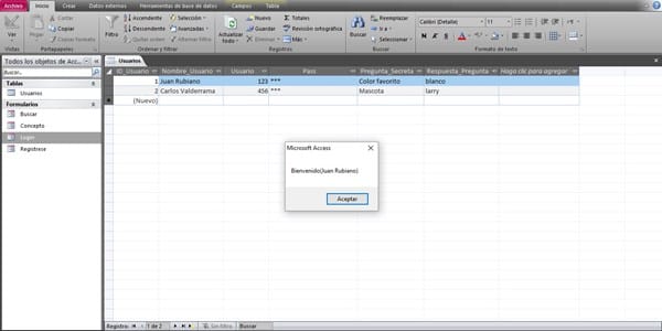 Como pueden observar el usuario ingresado es el número 2, valida y permite ingresar, pero arroja un mensaje con el nombre del usuario 1