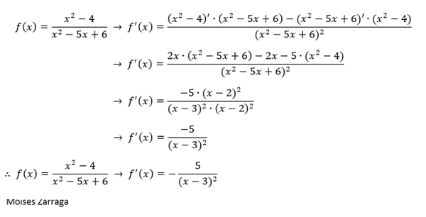 $$\begin{align}&f(x)={x^2-4\over x^2-5x+6} \ \ \ hallar \ \ f \ prima\\&\\&\end{align}$$$$\begin{align}&A. \ \ \ \ \ {-5\over x^2-6x+9}\end{align}$$$$\begin{align}&B. \ \ \ \ \ \ \ \ {-2x-5\over x^2-6x+9}\end{align}$$$$\begin{align}&C. \ \ \ \ \ \ \ \ {-5(x+2)\over x^2-6x+9}\end{align}$$$$\begin{align}&D. \ \ \ \ \ \ \ \ \ {-5(x^2+4x-4)\over x^2-6x+9}\end{align}$$