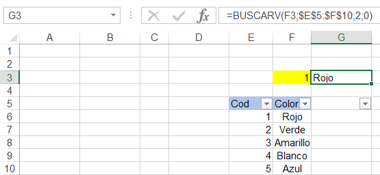 En la celda G3 coloqué esa fórmula que trae el color que corresponda a lo que tengas indicado en la celda F3 (en amarillo). Cuando encuentra el valor en la primera columna del rango indicado (E), muestra lo que haya en la columna 2 de ese rango.