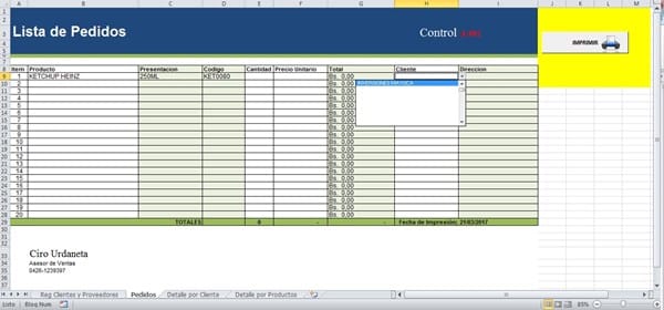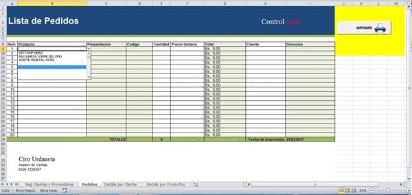 Demostración de Hoja de pedido con lista desplegable como validación de datos productos