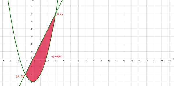 $$\begin{align}&y=2x\\&y=x^2-3\\&\\&Puntos de corte==>Igualando\\&x^2-3=2x\\&\\&x^2-2x-3=0\\&\\&x_1=-1\\&x_2=3\\&\\&Area=\int_{-1}^3 2x-(x^2-3)]dx=\Big[x^2- \frac{x^3} 3+3x \Big]_{-1}^3=\\&\\&\Big(3^2- \frac {3^3} 3+3(3) \Big)-\Big((-1)^2- \frac{(-1)^3} 3+3(-1)\Big)=\\&9-9+9-(1+ \frac 1 3-3)= \frac { 32} 3\ =10. \overline 6 \ \ u^2\end{align}$$