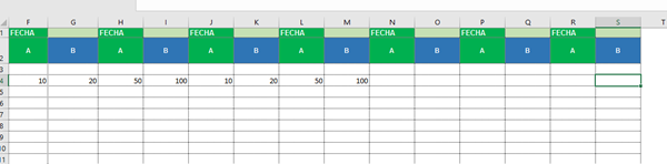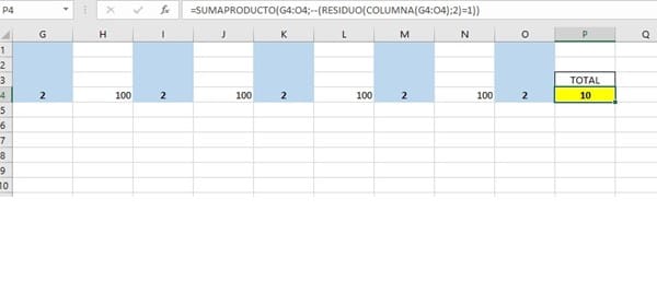 Quisiera saber como se realiza la suma de la columna G hasta ... "S" intercaladas (G, I, Q, M, O, Q...). La información se encuentra registrada desde la columna F4 ... La idea es solo sumar las columnas azules