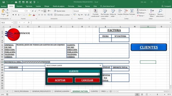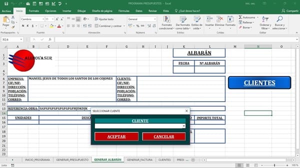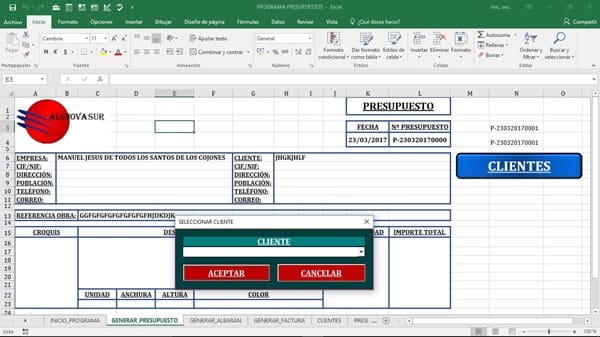 Ingresar nombre de cliente en la casilla cliente de la hoja que esté activa