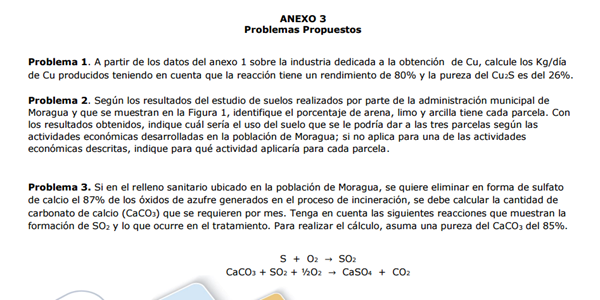 La población de Moragua se encuentra ubicada en el interior del país y se caracteriza por estar a 2252 m.s.n.m. Tiene una población de 859.013 habitantes y su desarrollo económico proviene de la agricultura, la industria y la explotación de metales. En promedio, el ingreso por per-cápita de la población urbana es de seis salarios mínimos legales vigentes, lo cual se relaciona a los altos niveles de contaminación antrópica por su nivel adquisitivo en el comercio, al generarse 2.46 Kg de residuos urbanos por habitante día. Estudios realizados en los residuos dispuestos en el botadero a cielo abierto de la población de Moragua, registran un contenido de azufre (S) del 0.52% y una densidad de 0.22 g/cm3 , los cuales son incinerados en su totalidad. Una de las industrias se dedica a la obtención de cobre (Cu) que se encuentra en la corteza terrestre como mineral sulfatado al cual le aplican un tratamiento de sulfuro de cobre y oxígeno, con el fin de liberar el metal mencionado y crear una aleación con níquel (Ni) en donde la presencia de cobre corresponde al 21.3%, y cuya producción diaria corresponde a 33.63 toneladas. A continuación se muestra la reacción del proceso descrito: Cu2S + O2 → 2Cu + SO2 La administración municipal realizó un estudio de suelos en tres parcelas con el fin de identificar sus características físicas y químicas (Figura 1), para poder estimar su uso potencial. En el estudio realizado, se resalta en particular la parcela uno, en donde se identificaron especies químicas como Si4+, Al3+, Fe3+, Mg2+, Fe2+, O2-, OH y F- . En administraciones pasadas, se había realizado un estudio para el uso del suelo, en donde se delimitaron 13 hectáreas para el monitoreo de contaminación originada por la actividad agrícola y 37 hectáreas por la influencia y desarrollo industrial. Las fuentes de Carbono Orgánico Total (COT) del Río Talca, tiene origen sintético proveniente de detergentes y pesticidas; y origen natural gracias a los ácidos húmicos y fúlvicos los cuales son conocidos como polifenoles que son precursores de subproductos de desinfección. La descomposición de la celulosa en el suelo reacciona con las bacterias del mismo, formando los ácidos húmico y fúlvico. La agricultura como actividad económica de la población de Moragua, se basa en el cultivo de pradera del pasto Kikuyo (Penisetum Clandestium) con una producción de 1.2 Kg/m2 , el cual es utilizado para la alimentación del ganado normando tipo leche. El municipio cuenta con un inventario de 7500 cabezas de ganado con un promedio de producción de 10 L/animal_día, principal abastecedor de materia prima de una empresa lechera de esa zona del país. En la zona rural del municipio, cada familia (conformada por 5 integrantes en promedio), se dedica al cuidado de 150 animales. Con el fin de mejorar los cultivos de pradera, los agricultores emplean sustancias químicas como fertilizantes, cuyo contenido incluye Fósforo (P) y Nitrógeno (N), y sus elevadas concentraciones han generado altos niveles de eutrofización en las fuentes de agua donde se cultivan la truchas las cuales han bajado considerablemente los niveles de producción, debido concentraciones mayores a 7 ppm de Oxígeno Disuelto (parámetro que impide la vida acuática de peces por el exceso de algas en la superficie de la fuente hídrica) El cultivo de papa como actividad agrícola, presenta bajos índices de actividad económica ya que según las creencias, la morfología del suelo no permite desarrollar otra actividad a gran escala como lo es la ganadería tipo lechero. En la descrita población, se encuentra una megaminería a cielo abierto, donde emplean sustancias ácidas y metales pesados que alteran la corteza terrestre y la calidad del aire, como plomo (Pb), arsénico (As), mercurio (Hg), cadmio (Cd) y cloro hexavalente (Cl6+). A su vez, la explotación minera artesanal emplea mercurio (Hg) para la extracción de oro (Au) formando una amalgama, la cual al ser sometida a temperaturas superiores de 357 °C (temperatura de ebullición del Hg), separa el Au del Hg el cual pasa a un estado gaseoso. La industria minera por ser artesanal, no tiene controles de emisiones ni de vertimientos, de los cuales el 50% del caudal desemboca aguas abajo (2 Km) de un río donde hacen la bocatoma de la Planta de Tratamiento de Agua Potable (PTAP) y el otro 50% se envía a la Planta de Tratamiento de Agua Residual (PTAR). En una zona rural alejada de la población (que se encuentra a 1893 m.s.n.m) durante casi siete años fumigaban los terrenos con Glifosato (plaguicida organofosforado), debido a los cultivos de coca que allí se daban y que están prohibidos por disposición nacional.