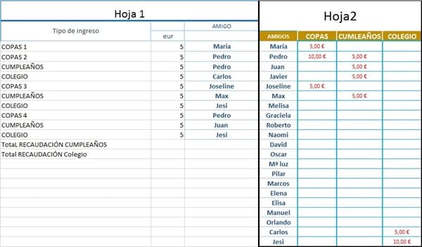 Como hago para sumar la cantidad correspondiente a casa amigo, ¿si en la hoja 1 algunos amigos se repiten y hay que sumar dos cantidades?
