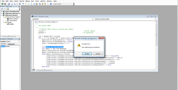 Entra al menú de VBA, Herramientas, Referencias, busca la referencia : Microsoft CDO for windows 2000 library", la marcas y presiona Aceptar.