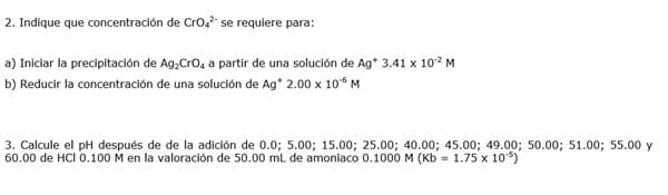 Análogamente, para reducir la concentración de Ag(+) a un valor determinado tendremos que añadir CrO4(2-) suficiente para que precipite el resto de Ag(+) y quede la cocentración requerida. Si queremos que quede una concentración de Ag+ de 2,00·10^-6, la concentración de CrO4(2-) la calcularemos así: