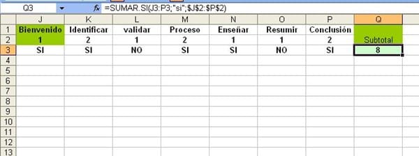 Esta es mi tabla, lo que esta en paréntesis es el valor de cada celda, entonces deseo sumar todos los SI que equivalen a 1 y los SI que equivalen a 2 para saber cuanto es la puntuación total.