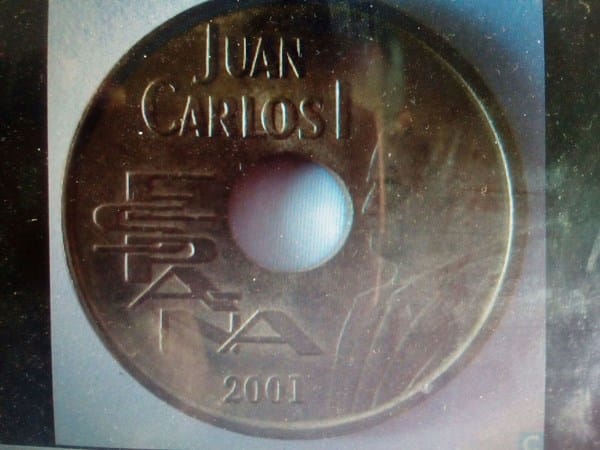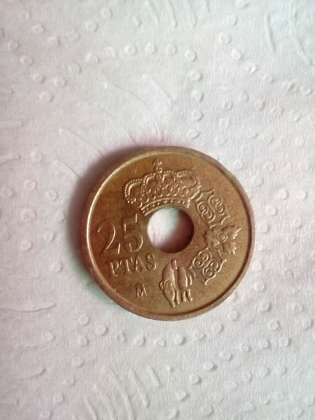 Quisiera saber el valor de esta moneda de 25 ptas del año 2000 tiene un fallo en el agujero que tiene en el centro