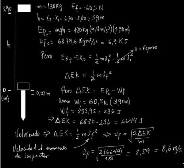 En la construcción de un edificio se tiene un martillo de acero con masa de m1 kg que se levanta x1m sobre el tope de una viga en forma de I vertical, que se está clavando en el suelo. El martillo se suelta, metiendo la viga -I- otros x2cm en el suelo. Los rieles verticales que guían el martillo ejercen una fuerza de fricción constante de fr N sobre éste. Use el teorema trabajo-energía para determinar