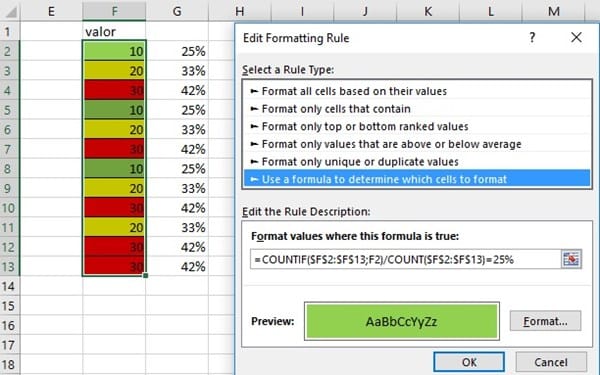 Formato condicionado para celdas en que valor se repita un % de veces del total de celdas