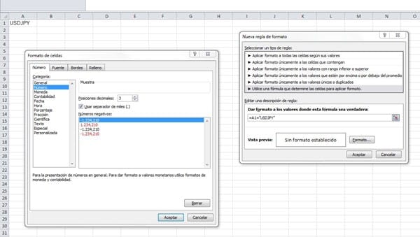 Cómo hago para hacer un formato condicional que en la celda B1 me coloque en número con tres decimales si la celda A1 contiene la palabra USDJPY.