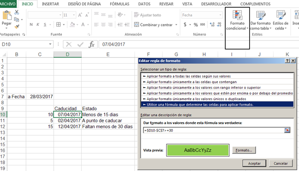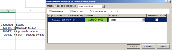 Como notarás, esa fórmula que coloqué en la casilla evalúa que falte más de 30 días (o igual) para el vencimiento indicado en la celda (como fuera que se la hayas indicado: por fórmula o valor).