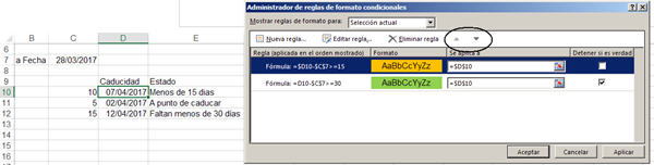Notarás que se agrega arriba de la regla anterior. Tendrás que moverla abajo con los botones que te marco en el óvalo. También es importante que marques Detener si es verdad para que no siga evaluando la condición siguiente.