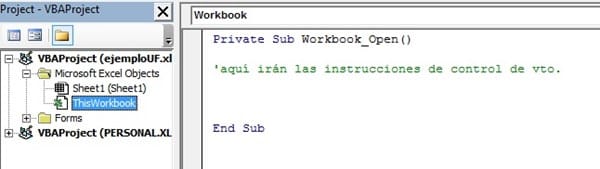 Para que funcione, activa el editor de Visual Basic (presiona Alt+F11) y la hoja que dice "ThisWorkbook" (o "EsteLibro" según la versión"), copia el código siguiente y pégalo en el panel desplegado a la derecha de su Editor de Visual Basic: