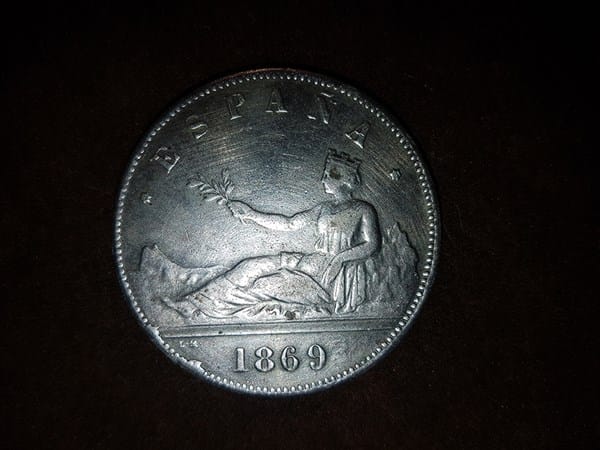 Moneda de cinco pesetas del año 1869