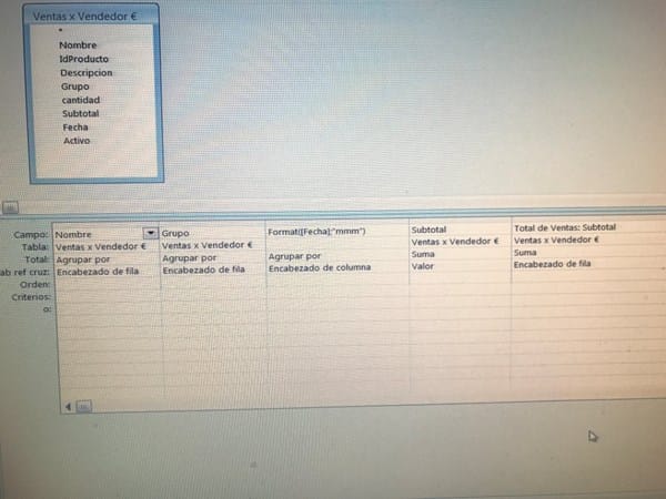 Tengo un formulario basado en una consulta de referencias cruzadas. En el encabezado de fila tengo los nombres de los vendedores y dos tipos de ventas (internas y externas) y en el encabezado de columna tengo los datos de las ventas en meses. En la interesección de ambos tengo las ventas en euros.