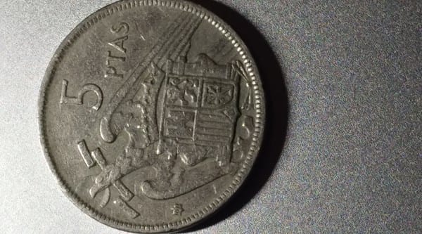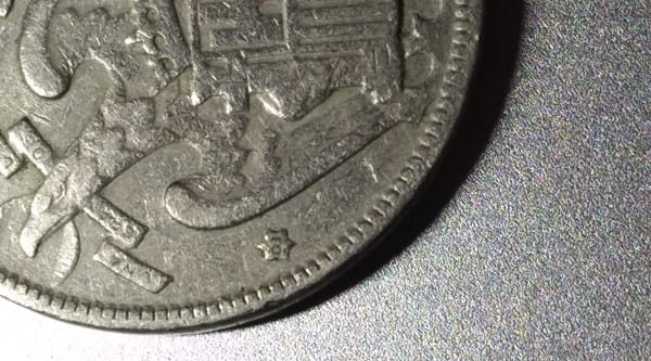 Tengo esta moneda de 5 pesetas de 1957 con *01 o eso parece pero no he encontrado ninguna información, ¿es posible que sea una falsificación de la época? ¿De ser así que valor tiene?