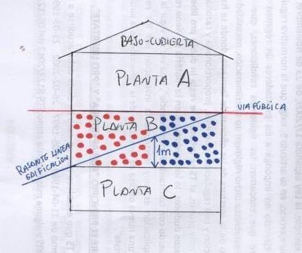 El razonamiento del arquitecto municipal es que la superficie de la Planta B de la imagen cuyo piso está más de 1 metro por debajo de la linea de edificación, la califica como Planta Semisótano (parte punteada en azul) .